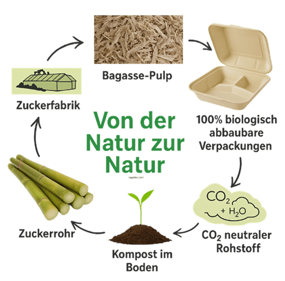 Bagasse ist ein Paradebeispiel für die intelligente Nutzung natürlicher Ressourcen. Aus den Rückständen der Zuckerproduktion entsteht ein stabiles, hitzebeständiges und zu 100 % biologisch abbaubares Verpackungsmaterial.Seit 2017 verarbeiten unsere Partner diesen Rohstoff für uns zu Menüboxen und Take-away-Verpackungen, die herkömmliche Kunststoffe ersetzen.